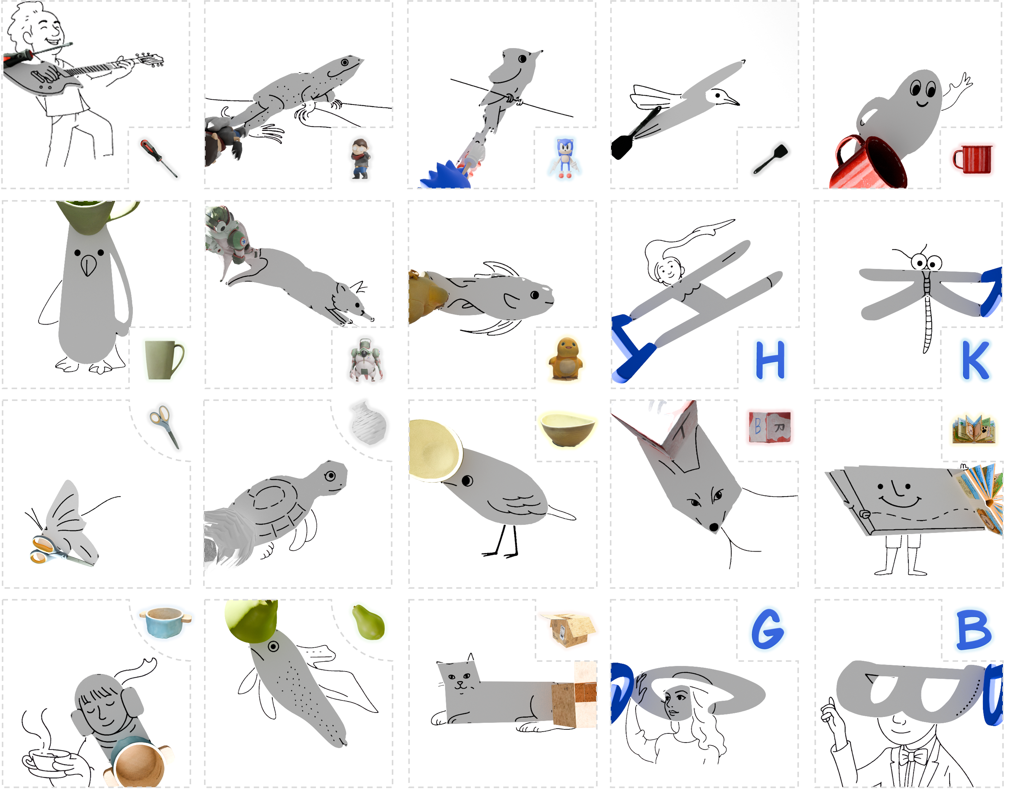 We showcase a collection of shadow-drawing compositions generated by our framework. Each composition is a result of a different scene configuration, including different object poses and light directions.